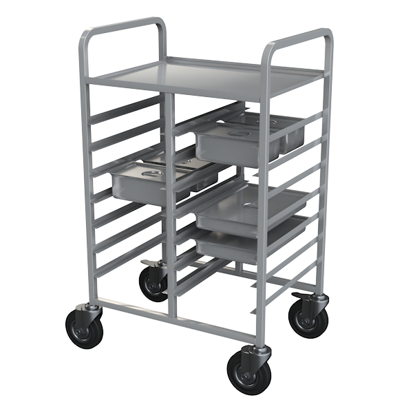 - Концевые отгибы направляющих обеспечивают фиксацию гастроемкостей и предотвращают их выпадение при движении тележки. Расстояние между направляющими по высоте – 100 мм.