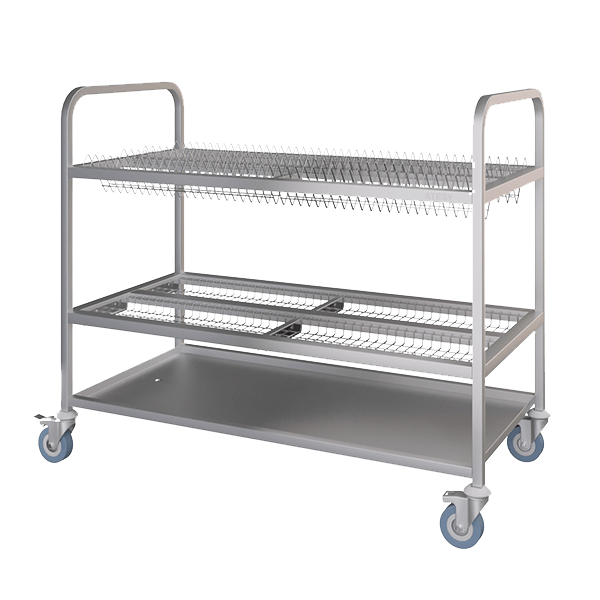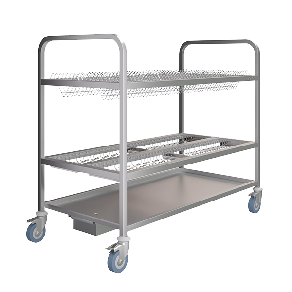 - Тележка оснащена поддоном из нержавеющей стали с отверстием для стока воды и небольшим уклоном в сторону этого отверстия.