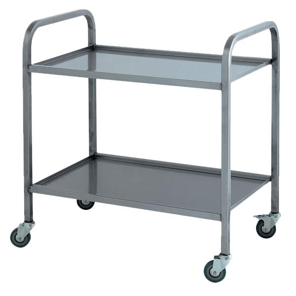 - Тележка с 2 полками из нержавеющей листовой стали, расстояние между полками — 440 мм.