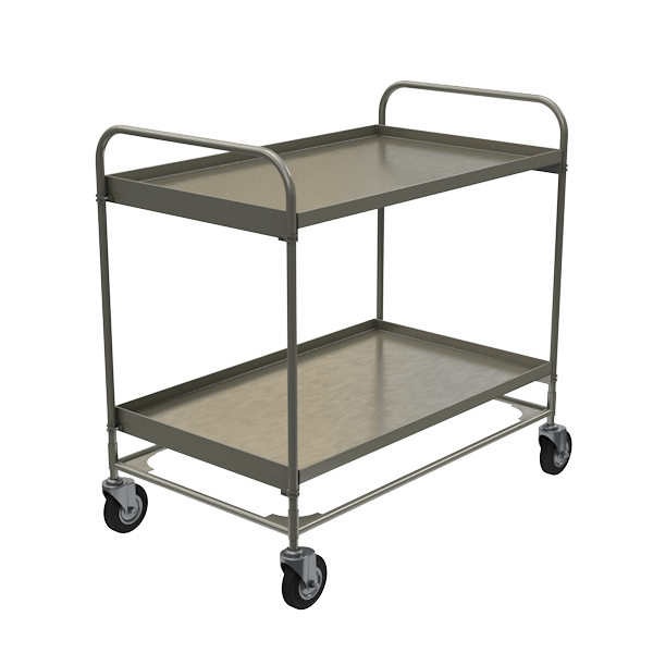 - Состоит из двух полок выполненных из нержавеющей стали и колесами из серой резины.