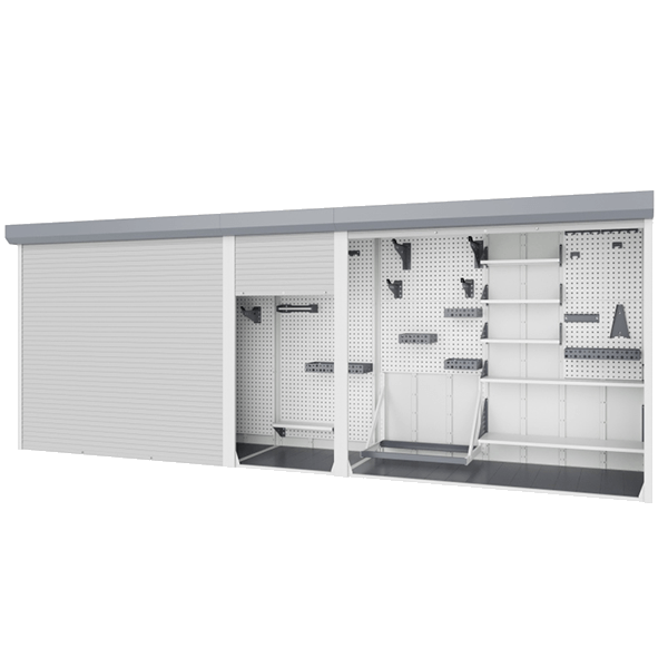 - Представляет собой сборно-разборную конструкцию, состоящую из набора панелей, двух соединительных рам и трёх комплектов роллетных модулей.