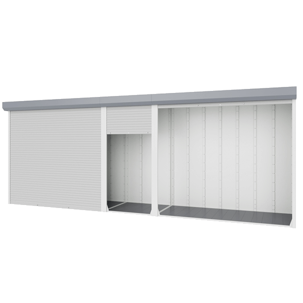 - Конструкция включает металлические панели, две соединительные рамы и три роллетных модуля для удобного доступа.