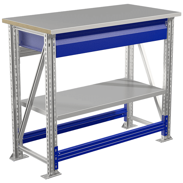 - Состоит из: опоры МF-1 (2 шт), балки M 90 (3 шт), столешницы МТ-100 (1 шт), ящика верстачного М-140 (1 шт), полки верстачной М-100 (1 шт).