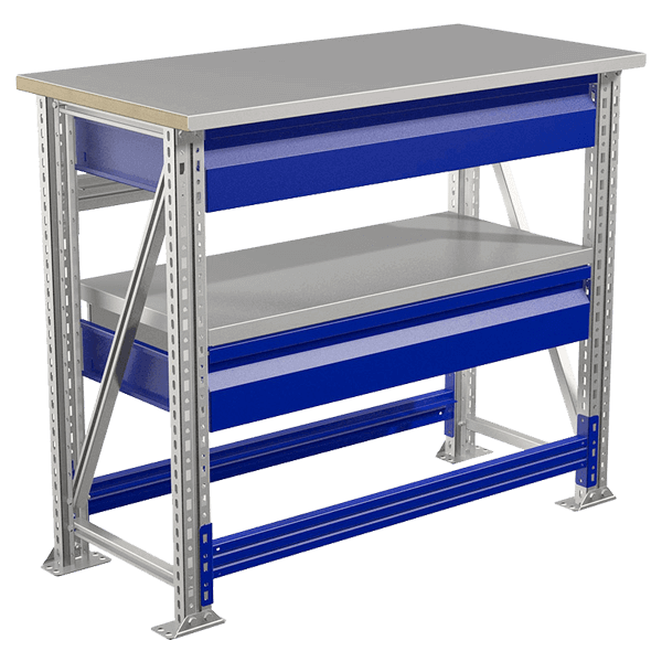 - Состоит из: опоры МF-1 (2 шт), балки M 90 (3 шт), столешницы МТ-100 (1 шт), ящика верстачного М-140 (2 шт), полки верстачной М-100 (1 шт).