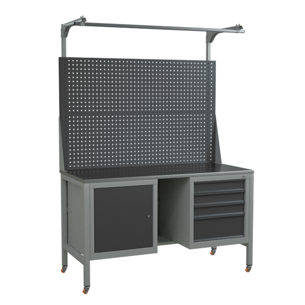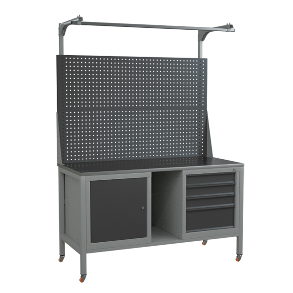 - Оснащён оцинкованной столешницей, перфорированным экраном с консолями, двумя инструментальными тумбами и 4 колёсами, 2 из которых с тормозом.