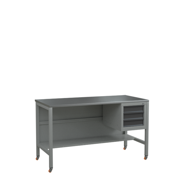 - Оснащён оцинкованной столешницей, инструментальной тумбой и 4 колёсами, 2 из которых с тормозом.