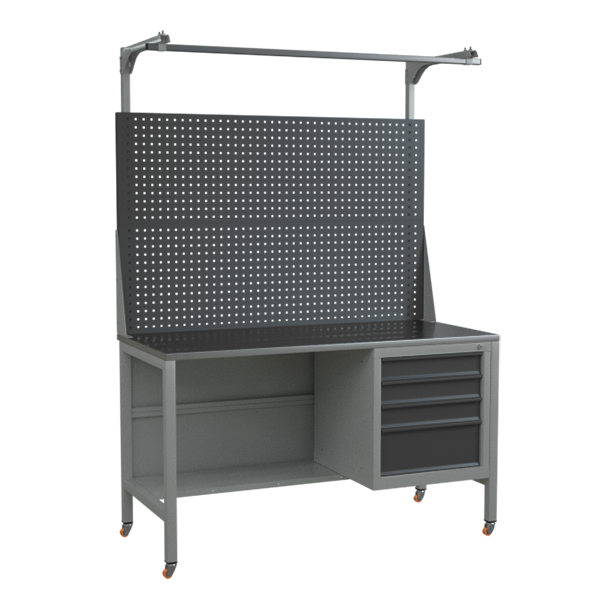 - Оснащён оцинкованной столешницей, двойным перфорированным экраном и инструментальной тумбой с 4 выдвижными ящиками.