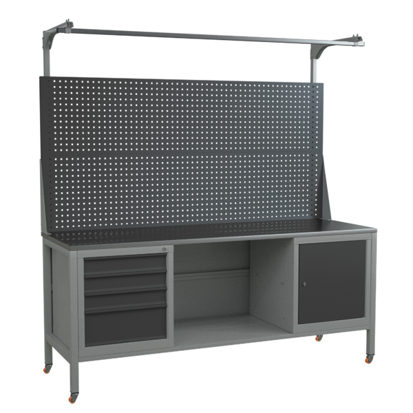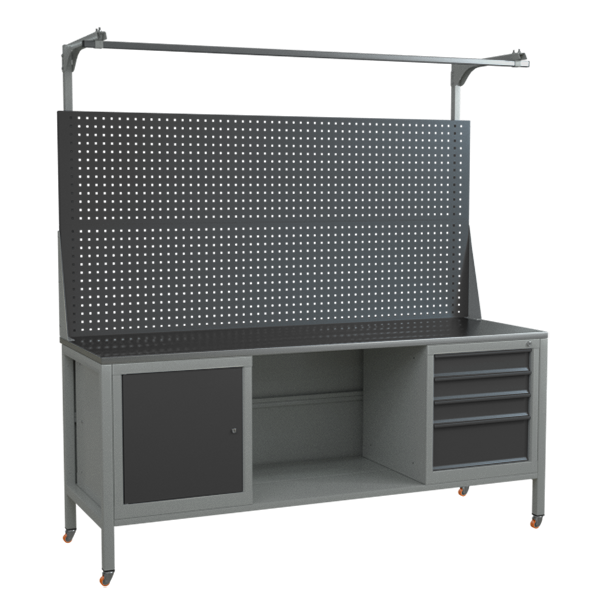 Верстак 2000 с колёсами, двойным экраном и тумбой с 4 выдвижными ящиками и тумбой с дверцей и полкой