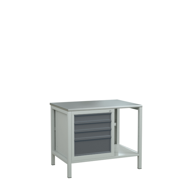 - Слесарно-сборочный верстак с оцинкованной столешницей и тумбой с четырьмя выдвижными ящиками.