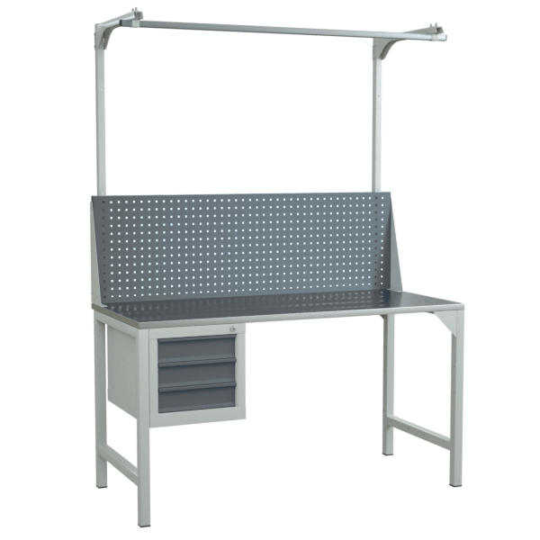 - Оснащён оцинкованной столешницей и одной инструментальной тумбой с тремя выдвижными ящиками.