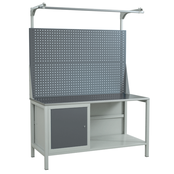 - Оснащён оцинкованной столешницей, перфорированным двойным экраном с консолями и подвесной инструментальной тумбой с распашной дверцей и одной полкой.