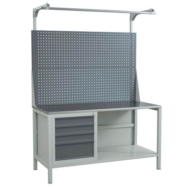 - Оснащён подвесной инструментальной тумбой с 4 выдвижными ящиками и двойным перфорированным экраном с консолями.