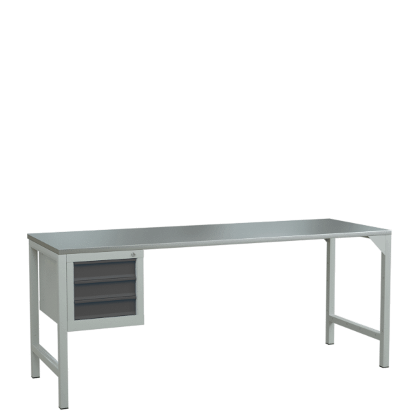 - Оснащён оцинкованной столешницей и подвесной тумбой с тремя выдвижными ящиками.