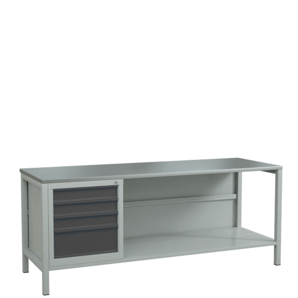 - Оснащён оцинкованной столешницей и тумбой с 4 выдвижными ящиками.