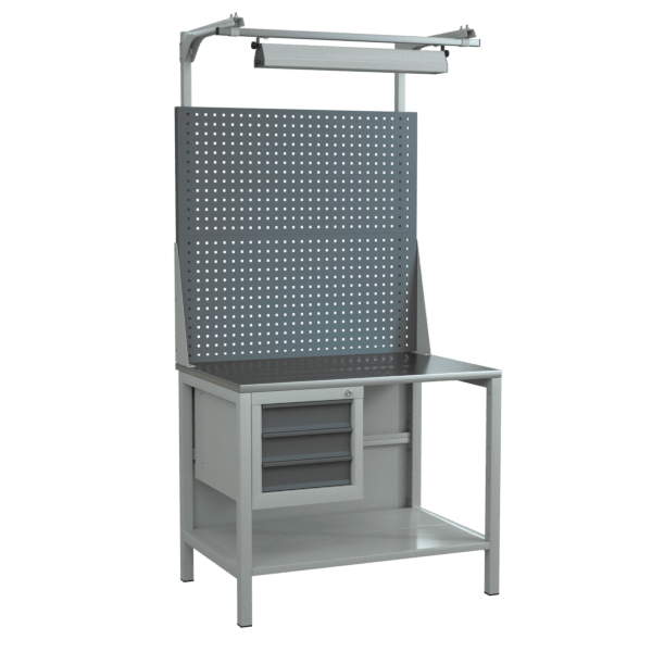 - Укомплектован оцинкованной столешницей, двойным перфорированным экраном, светодиодным светильником и подвесной тумбой с тремя выдвижными ящиками.