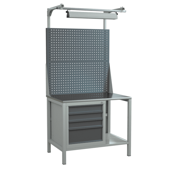 - Оснащён оцинкованной столешницей, двойным перфорированным экраном, светодиодным светильником и тумбой с тремя выдвижными ящиками.