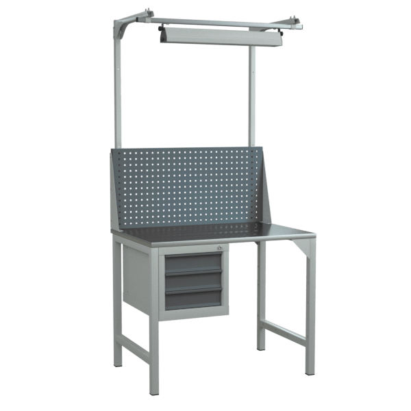 - Оснащён оцинкованной столешницей, одинарным либо двойным перфорированным экраном, светодиодным светильником и подвесной тумбой с тремя выдвижными ящиками.