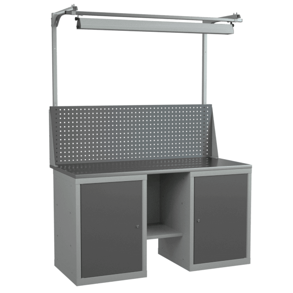 - Комплектуется оцинкованной столешницей, двумя тумбами, одинарным либо двойным перфорированным экраном с консолями и светодиодным светильником.
