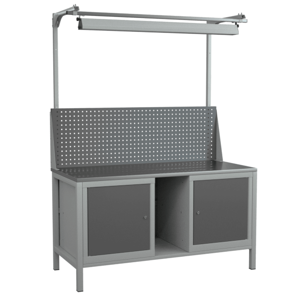 - Комплектуется оцинкованной столешницей, двумя тумбами, перфорированным экраном и светодиодным светильником.