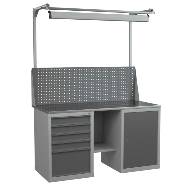 - Оснащён оцинкованной столешницей, двумя тумбами, перфорированным экраном с консолями и светодиодным светильником.