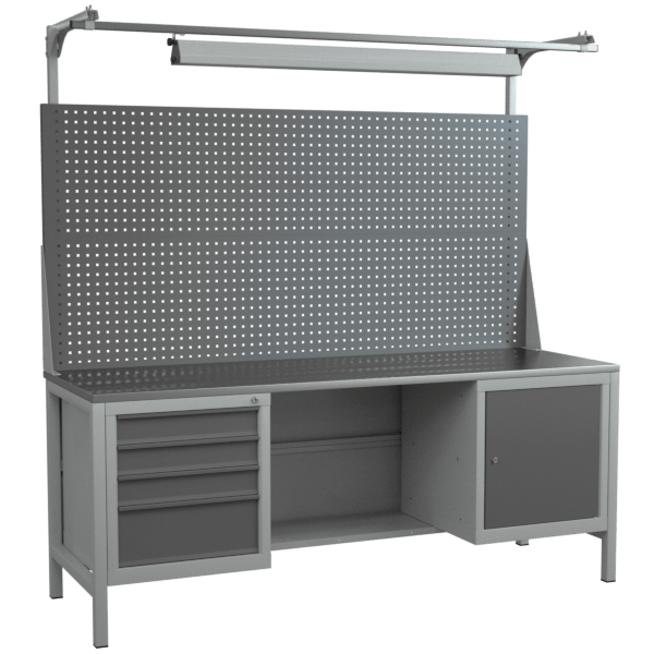 Верстак 2000 со светильником, двойным экраном, тумбой с 4 ящиками и тумбой с дверцей и полкой