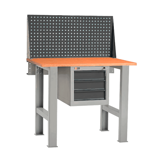 - На верстак металлический для гаража устанавливается перфорированный экран и подвесная тумба с тремя выдвижными ящиками.