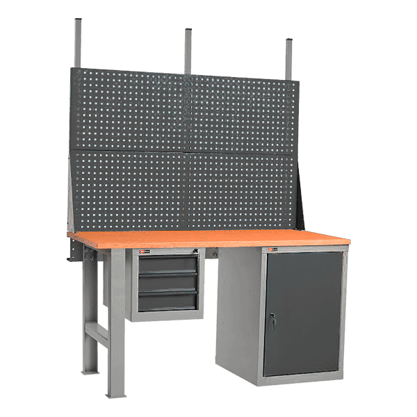 - На верстак устанавливается перфорированный экран и подвесная тумба с тремя выдвижными ящиками.