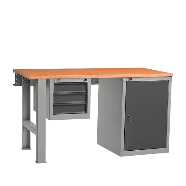 - Верстак комплектуется подвесной тумбой с тремя выдвижными ящиками.