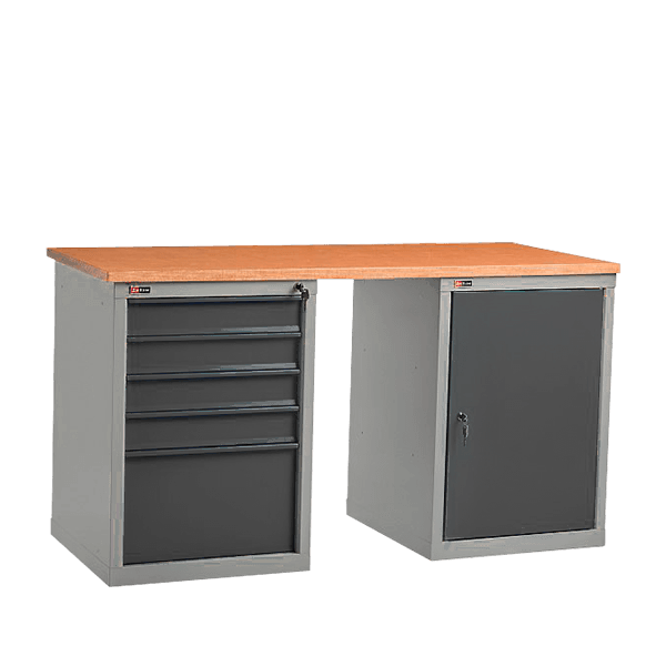- Опоры для столешницы: инструментальная тумба с двумя полками и распашной дверцей и тумба с пятью выдвижными ящиками.