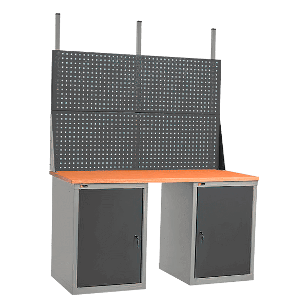 - Опоры для столешницы: 2 инструментальные тумбы с распашной дверцей и двумя полками.