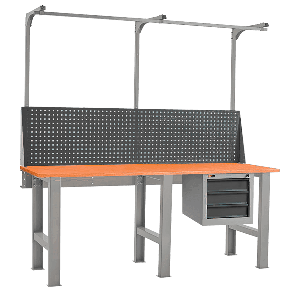 - На верстак слесарный двухместный устанавливается перфорированный экран, консоль и подвесная тумба с тремя выдвижными ящиками.