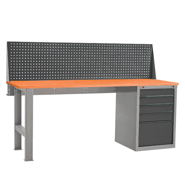 - Верстак оснащен перфорированным экраном, на который с помощью зацепов можно навешивать аксессуары.