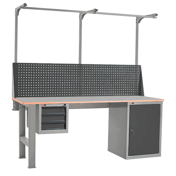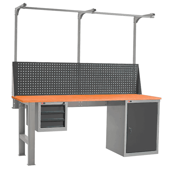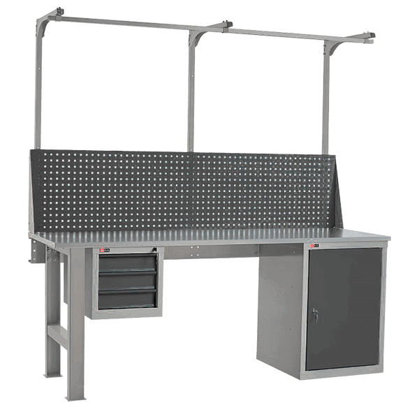 - На верстак устанавливается перфорированный экран, консоль и подвесная тумба с тремя выдвижными ящиками.