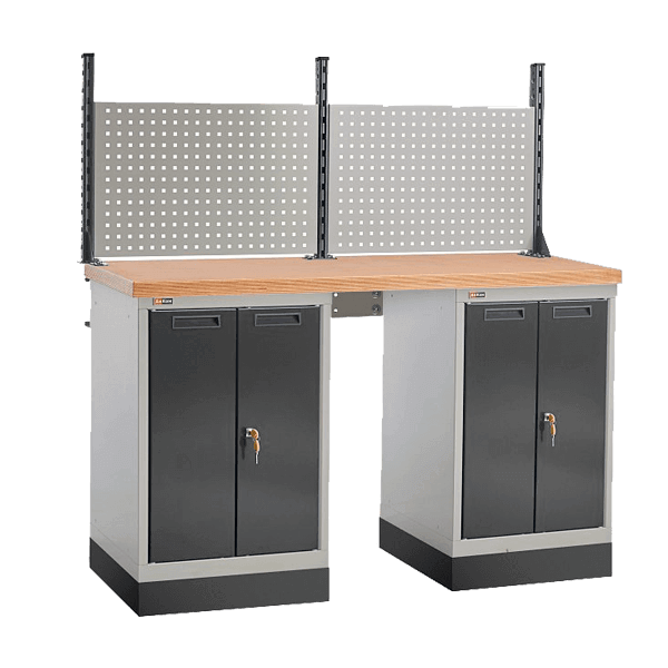 - Опоры столешницы – две напольные тумбы с запираемыми дверцами. Внутри тумб – перфорированные экраны на боковых стенках. Возможна дополнительная установка полок, нагрузка на каждую не более 200 кг.