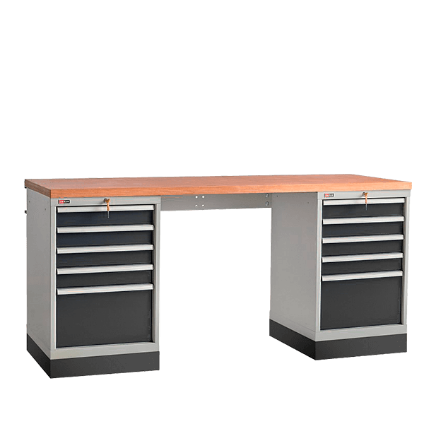 - Опоры столешницы – две напольные тумбы с 5 выдвижными ящиками, которые запираются на центральный замок. Ящики выдерживают нагрузку до 100 кг.